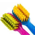 Szczoteczka ortodontyczna manualna (jak np. ta firmy Tello) ma wycięte włosie na środku żeby lepiej dopasować się do zamków. Pamiętaj żeby nie szorować zębów wzdłuż, a stosować ruchy wymiatania lub delikatnych kółeczek.Szorowanie w jednym kierunku może doprowadzić do ubytków klinowych i recesji dziąsła (recesji, czyli obniżania się linii dziąsła).