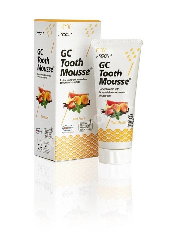 GC Tooth Mousse jest na bazie wody, zawiera rewolucyjny składnik RECALDENT (CPP-ACP: fosfopeptyd kazeiny – amorficzny fosforan wapnia). CPP-ACP wprowadzony do jamy ustnej gromadzi się na błonce nabytej, płytce nazębnej, bakteriach, hydroksyapatytach i tkance miękkiej dostarczając bioaktywny wapń i fosforan.